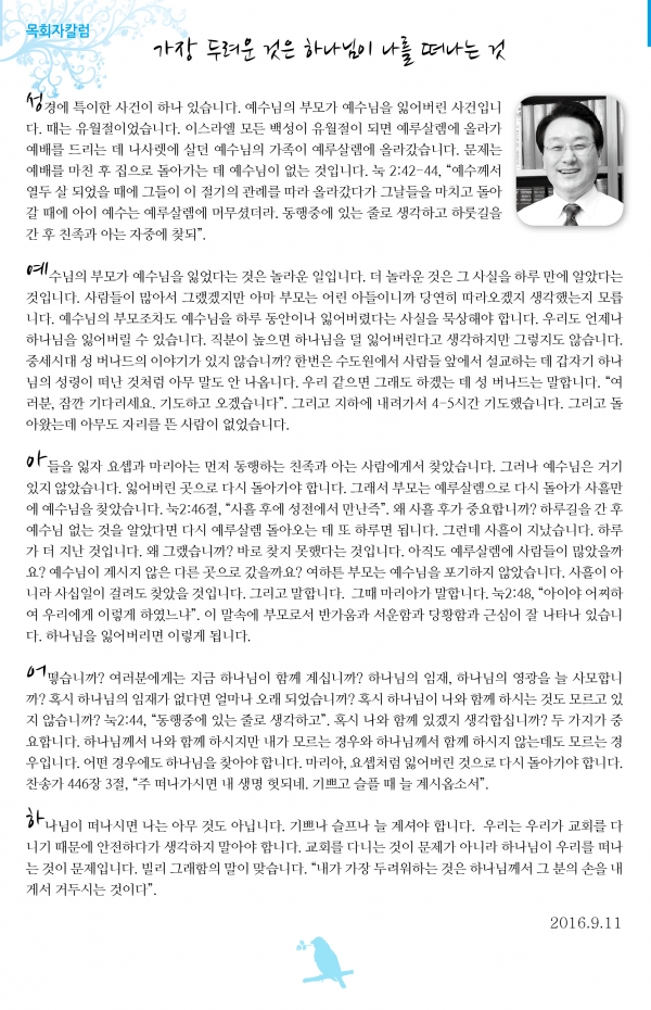 °¡Àå µÎ·Á¿î °ÍÀº Çϳª´ÔÀÌ ³ª¸¦ ¶°³ª´Â °Í[2016.9.11]