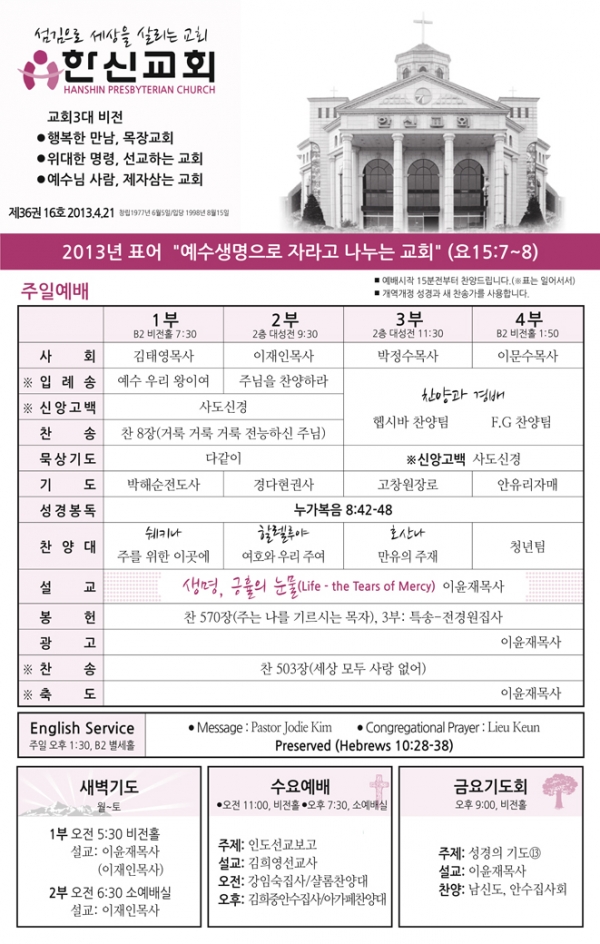 2013³â4¿ù ¼Â°ÁÖ(4/21)¿¹¹è, ±³È¸¼Ò½Ä |