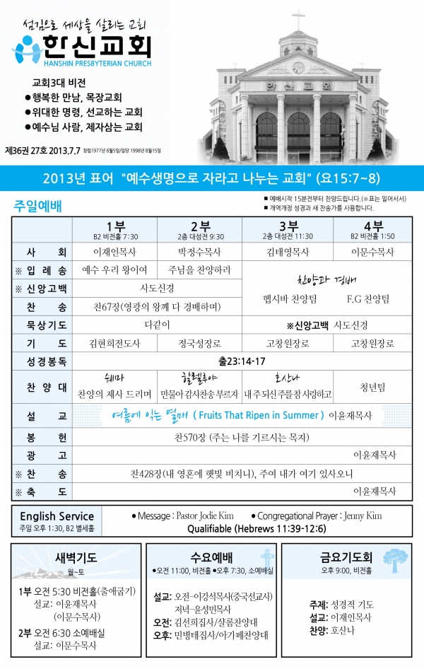 2013³â6¿ù ´Ù¼¸Â°ÁÖ(6/30)¿¹¹è, ±³È¸¼Ò½Ä