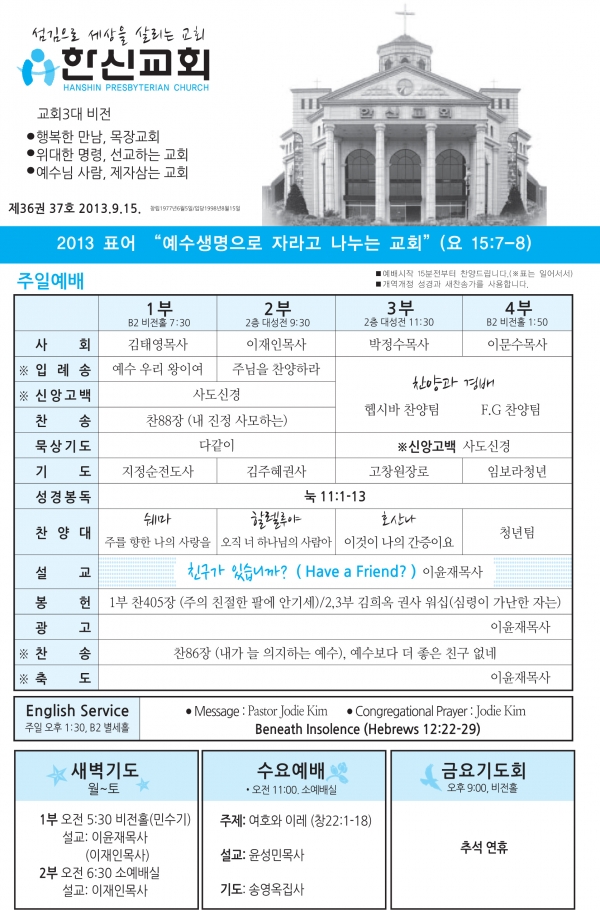 2013³â9¿ù ¼Â°ÁÖ(9/15)¿¹¹è, ±³È¸¼Ò½Ä |