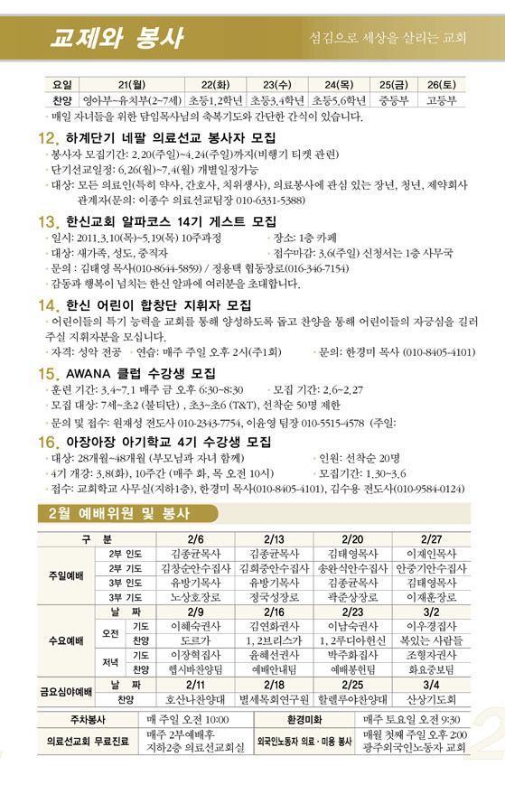 2011³â2¿ù ¼Â°ÁÖ(2/20) ¿¹¹è, ±³È¸¼Ò½Ä