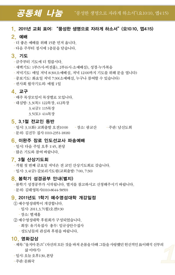 2011³â1¿ù ù°ÁÖ(1/2) ¿¹¹è, ±³È¸¼Ò½Ä