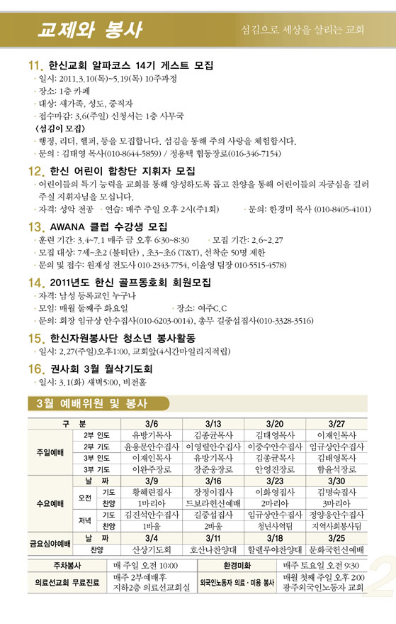 2011³â2¿ù ¼Â°ÁÖ(2/20) ¿¹¹è, ±³È¸¼Ò½Ä