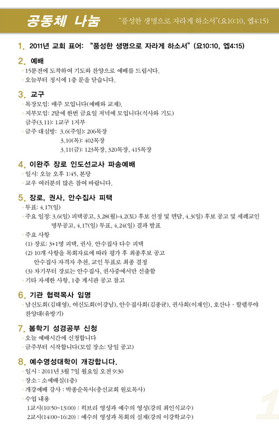 2011³â4¿ù ù°ÁÖ(4/3) ¿¹¹è, ±³È¸¼Ò½Ä