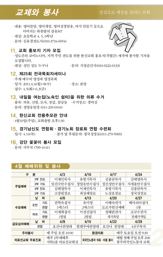 2011³â4¿ù ù°ÁÖ(4/3) ¿¹¹è, ±³È¸¼Ò½Ä