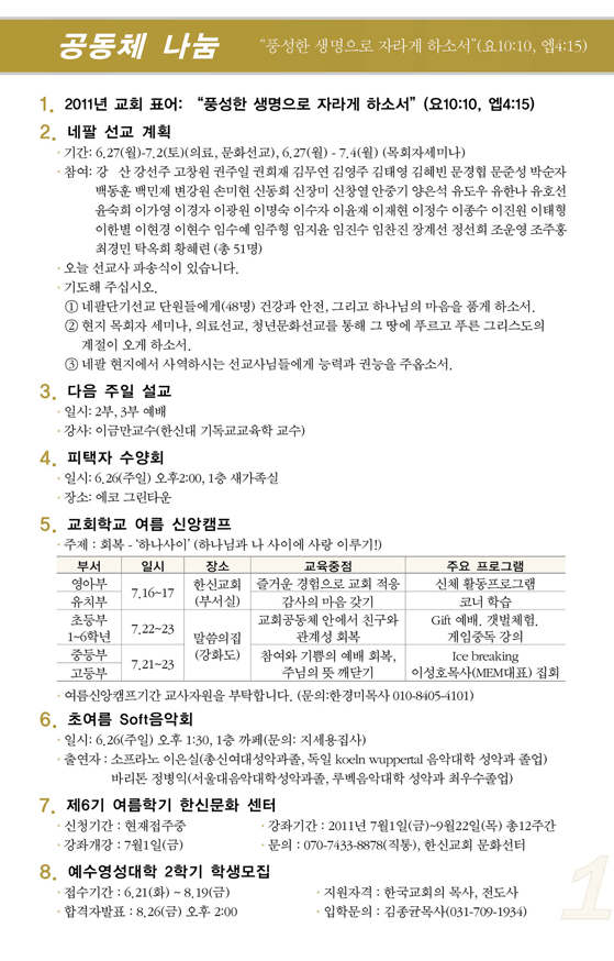 2011³â6¿ù ¼Â°ÁÖ(6/19) ¿¹¹è, ±³È¸¼Ò½Ä