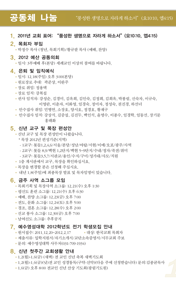 2011³â12¿ù ¼¼Â°ÁÖ(12/18)¿¹¹è, ±³È¸¼Ò½Ä |