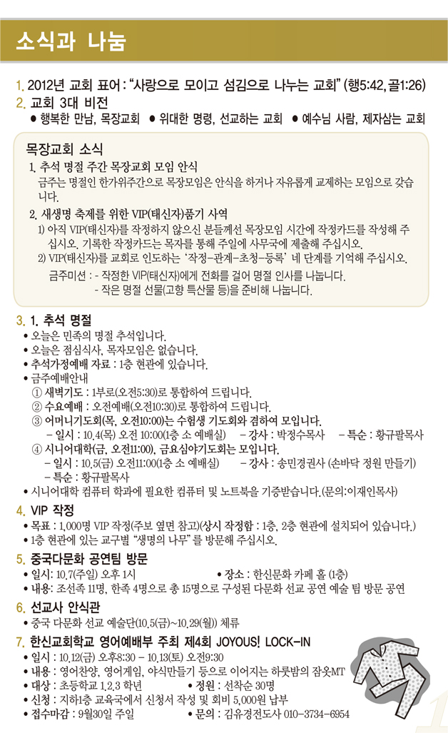 2012³â9¿ù ´Ù¼¸Â°ÁÖ(9/30)¿¹¹è, ±³È¸¼Ò½Ä |
