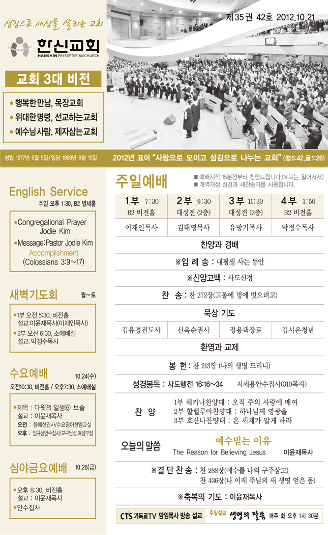 2012³â10¿ù ¼Â°ÁÖ(10/21)¿¹¹è, ±³È¸¼Ò½Ä |